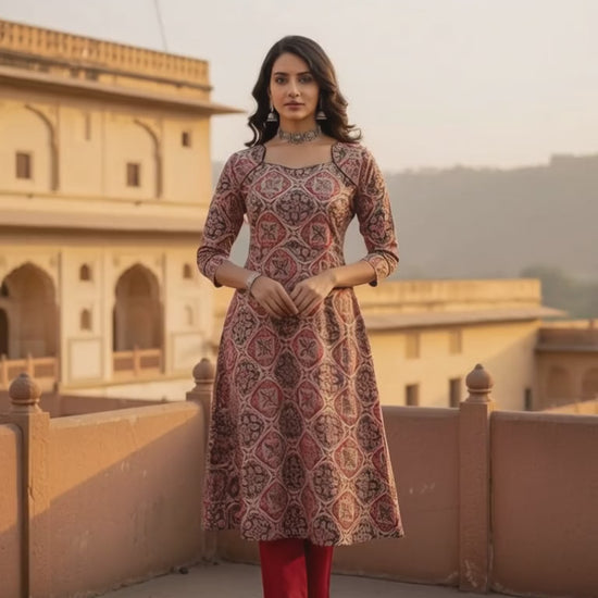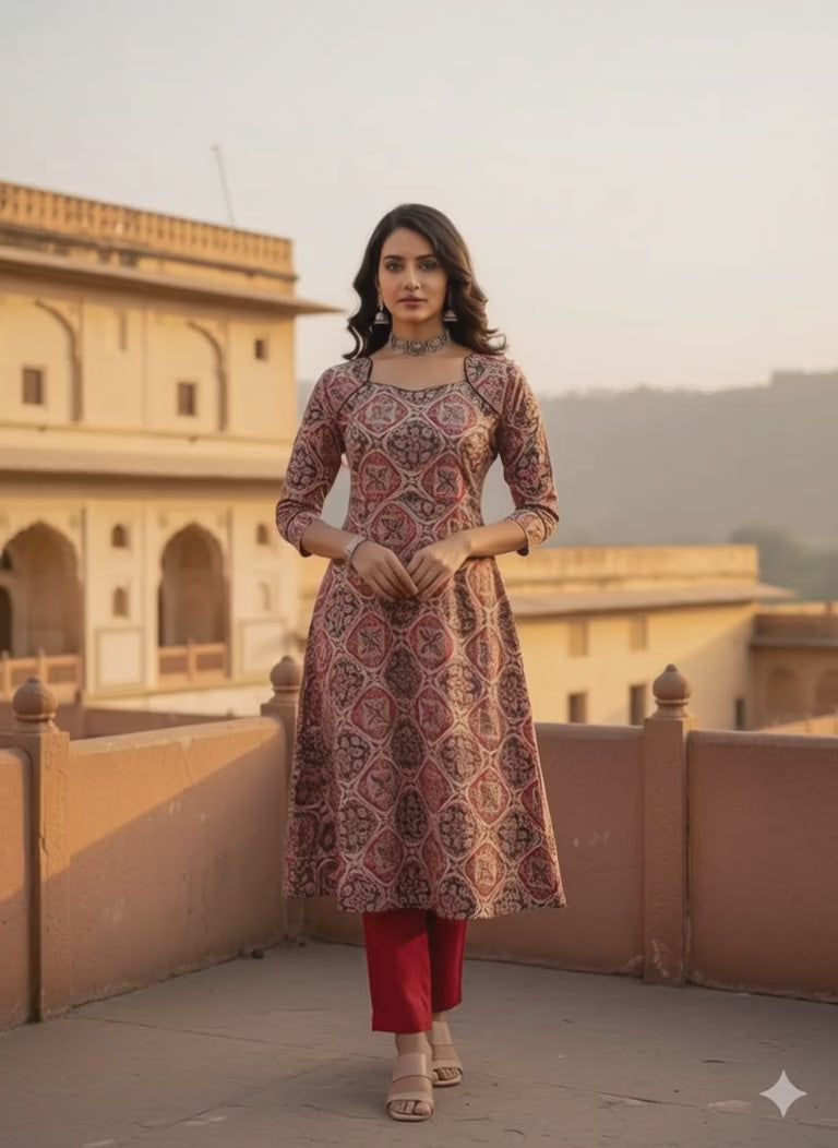 Experience timeless elegance with this premium A-line kurti and coordinated bottom set, featuring authentic Jaipuri cotton block prints. The kurti showcases a graceful round neckline with elbow sleeves, cut to 46 inches for a refined silhouette that flatters all body types. Paired with straight-fit cotton pants measuring 39 inches, this ensemble delivers comfort without compromising on style. The intricate block print patterns reflect traditional artisanal techniques, making this set ideal for festive celebrations, family gatherings, or everyday wear with understated sophistication.