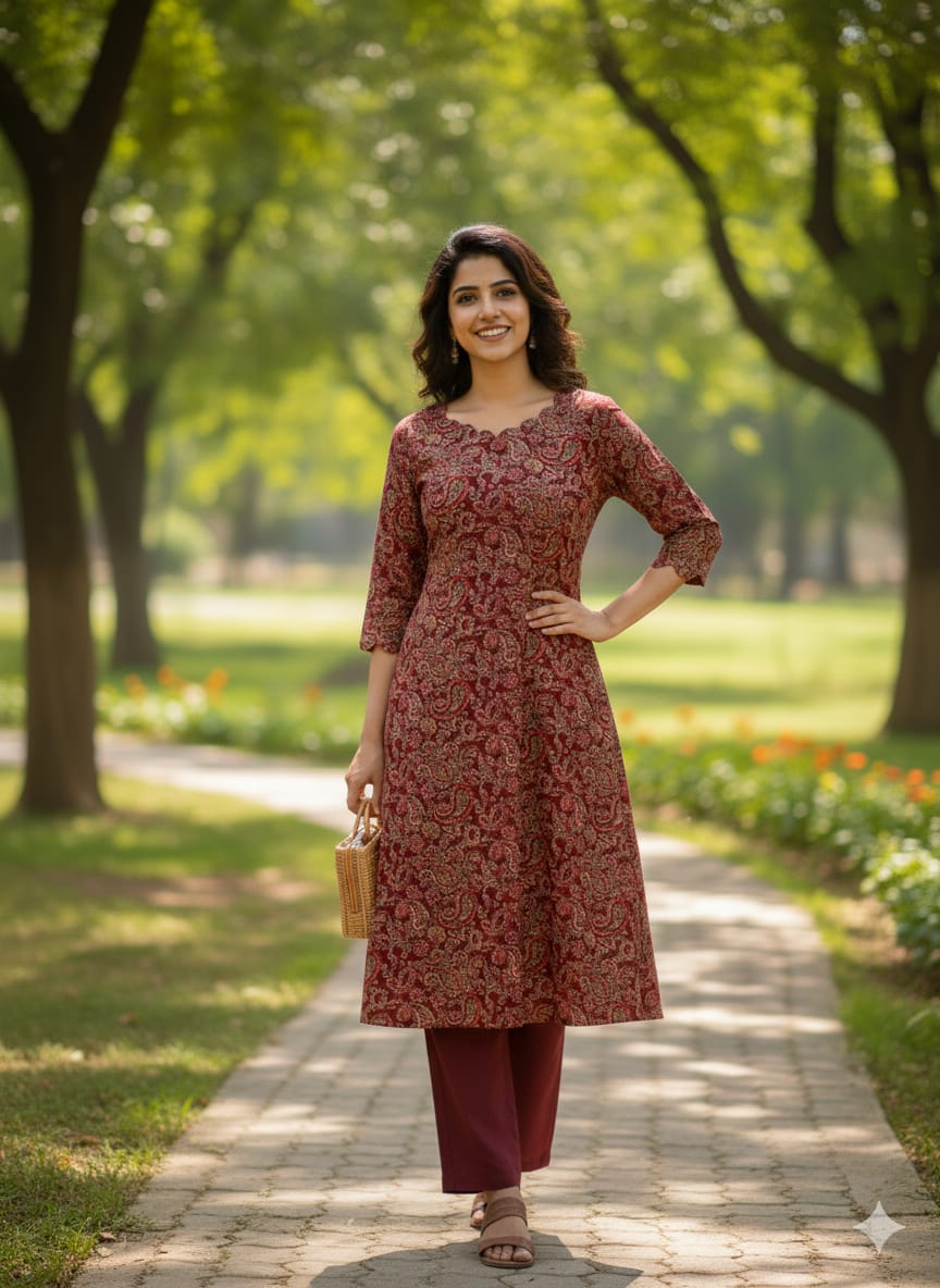 Elevate your ethnic wardrobe with our Kalamkari Prints Kurti Sets, featuring traditional hand-painted kalamkari fabric that showcases intricate artistry. The kurti boasts an elegant cut work neck design complemented by matching cut work detailing on the hands, creating a sophisticated silhouette. With a 44-inch length and paired straight-cut pants, this ensemble offers both comfort and refined style. Perfect for festive occasions, celebrations, or everyday elegance, these sets combine timeless craftsmanship with contemporary tailoring.